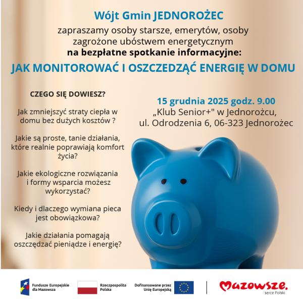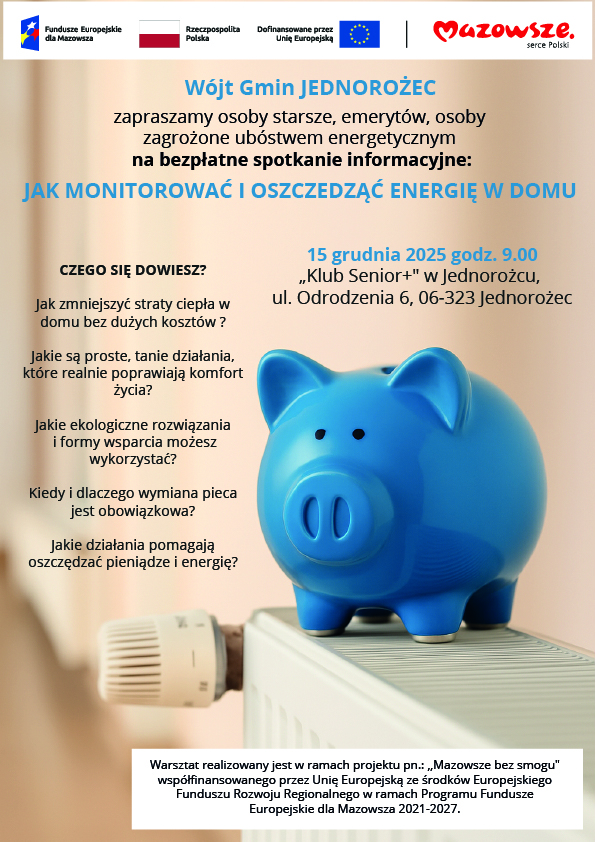 Gmina Jednorożec realizuje projekt "Mazowsze bez smogu" współfinansowany przez Unię Europejską ze środków Europejskiego Funduszu Rozwoju Regionalnego w ramach programu Fundusze Europejskie dla Mazowsza 2021-2027.