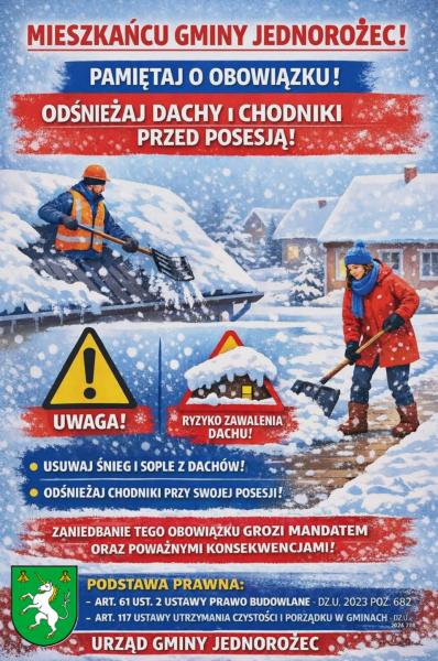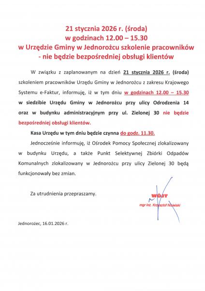 W związku z zaplanowanym na dzień 21 stycznia 2026 r. (środa) szkoleniem pracowników Urzędu Gminy w Jednorożcu z zakresu Krajowego Systemu e-Faktur, informuję, iż w tym dniu w godzinach 12.00 – 15.30 w siedzibie Urzędu Gminy w Jednorożcu przy ulicy Odrodzenia 14