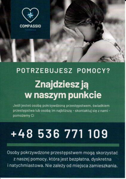Pomoc udzielana jest bezpłatnie. W ramach prowadzonego punktu udzielamy m.in. specjalistycznej pomocy prawnej, psychologicznej, materialnej, medycznej. Każdy przypadek traktowany jest indywidualnie a formy wsparcia są dopasowane pod kątem potrzeb osoby pokrzywdzonej przestępstwem.