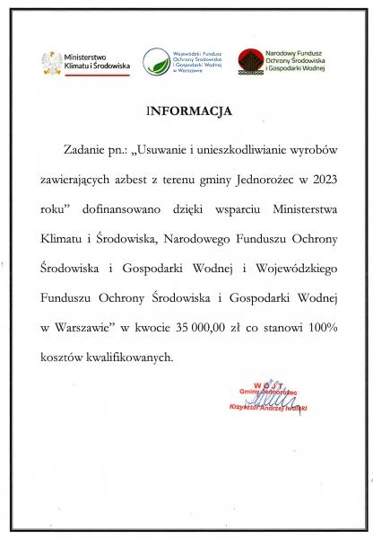Zadanie pn.: „Usuwanie i unieszkodliwianie wyrobów zawierających azbest z terenu gminy Jednorożec w 2023 roku” dofinansowano dzięki wsparciu Ministerstwa Klimatu i Środowiska, Narodowego Funduszu Ochrony Środowiska i Gospodarki Wodnej i Wojewódzkiego Funduszu Ochrony Środowiska i Gospodarki Wodnej w Warszawie” w kwocie 35 000,00 zł.