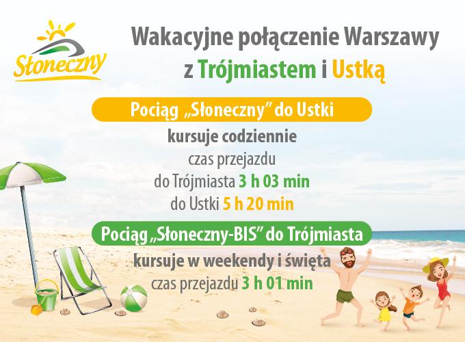 „Słoneczny” do Ustki wyjeżdża z Warszawy Wschodniej o godzinie 6.05 „Słoneczny – BIS” do Gdyni Głównej, wyjeżdża z Warszawy Wschodniej o godzinie 9.31. Podróż "Słonecznym" i „Słonecznym – BIS”