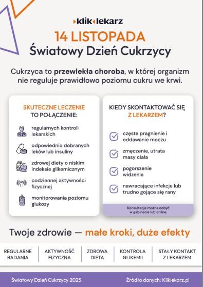 Światowy Dzień Walki z Cukrzycą przypomina, jak ważne jest wczesne rozpoznanie objawów, świadoma profilaktyka oraz dostęp do skutecznych metod leczenia. Nowoczesne podejście terapeutyczne pozwala wielu pacjentom prowadzić aktywne i bezpieczne życie, a w części przypadków znacząco spowalnia rozwój choroby.