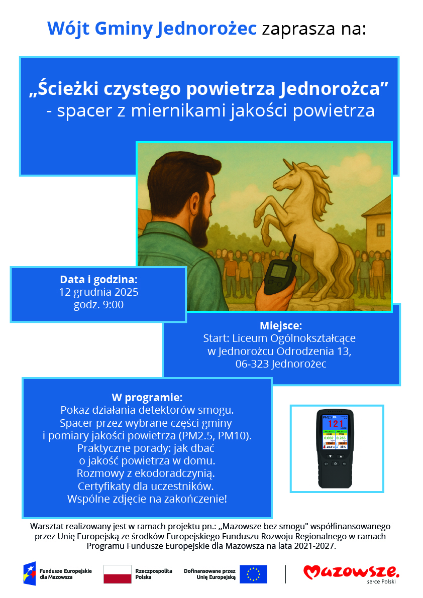 Podczas wydarzenia uczestnicy otrzymają „Ścieżki czystego powietrza Jednorożca”, opracowany specjalnie dla mieszkańców Mazowsza. Publikacja zawiera praktyczne porady dotyczące wymiany nieefektywnych źródeł ciepła, zasad prawidłowego spalania oraz informacji o programach wsparcia, takich jak „Czyste Powietrze”. Dla najmłodszych przygotowano także kolorowankę edukacyjną.
