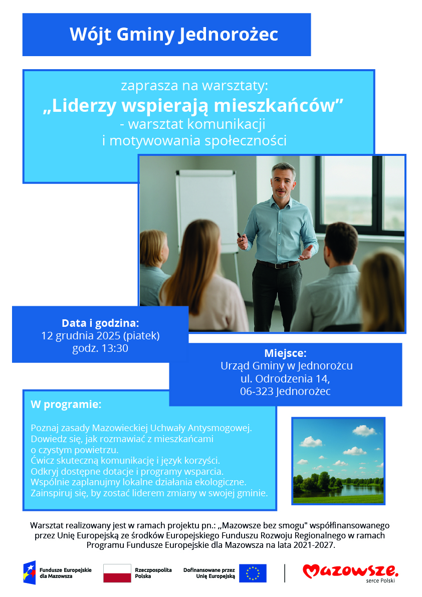Warsztat realizowany jest w ramach projektu pn. „Mazowsze bez smogu”, współfinansowanego przez Unię Europejską ze środków Europejskiego Funduszu Rozwoju Regionalnego w ramach programu Fundusze Europejskie dla Mazowsza na lata 2021–2027.