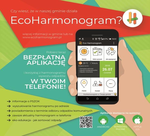 nr rachunku bankowego, itp. Aplikację EcoHarmonogram można pobrać na urządzenia mobilne z systemem Android oraz iOS (za darmo) tak jak każdą inną aplikację. Na telefonie otwieramy sklep z aplikacjami (sklep Play, App Store) wyszukujemy EcoHarmonogram i klikamy 'Zainstaluj'. Po otwarciu aplikacji wystarczy podać adres posesji zgodnie z informacjami wyświetlonymi na ekranie urządzenia. Zachęcamy do korzystania z aplikacji.