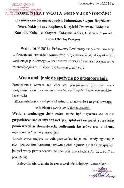Woda nadaje się do spożycia po przegotowaniu Przegotowania wymaga też woda do: przygotowania posiłków, mycia spożywanych na surowa warzyw i owoców, mycia zębów, kąpieli noworodków i niemowląt Wodę należy gotować przez 2 minuty, a następnie bez gwałtownego schładzania pozostawić do ostudzenia.