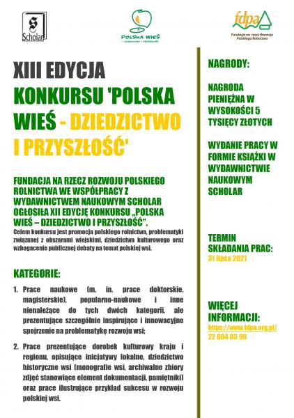 Prace prezentujące dorobek kulturowy kraju i regionu, opisujące inicjatywy lokalne, dziedzictwo historyczne wsi (monografie wsi, archiwalne zbiory zdjęć stanowiące element dokumentacji, pamiętniki) oraz prace ilustrujące przykład sukcesu w rozwoju polskiej wsi.