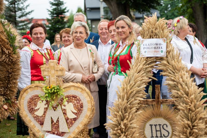 Uroczystości rozpoczęły się od przemarszu korowodu z wieńcami i koszami dożynkowymi z przed budynku Urzędu Gminy Jednorożec na plac przy kościele. W korowodzie wzięli udział przedstawiciele władz samorządowych z całego Powiatu Przasnyskiego oraz sołectw Gminy Jednorożec i gmin Powiatu Przasnyskiego wraz z pocztami sztandarowymi. Wieńce i kosze dożynkowe ustawiono na podeście przed kościołem, gdzie można było podziwiać ich misterne wykonanie. Na uroczystej mszy świętej poświęcono plony i chleb dożynkowy oraz podziękowano za tegoroczne zbiory. Dary w trakcie mszy przekazał Wójt Krzysztof Nizielski wraz z małżeństwem rolników Agatą i Krzysztofem Merchel. Młodzieżowa orkiestra dęta przy OSP Ulatowo- Pogorzel oraz zespół Młode Kurpie zadbali o oprawę muzyczną mszy. Procesja z wieńcami oraz dzielenie chleba dożynkowego na scenie przy kościele zakończyły pierwszą część Dożynek.