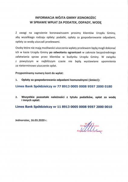 Od dnia 16 marca 2020 r. do dnia odwołania, zostają zawieszone dyżury Przewodniczącego Rady Gminy Jednorożec.
