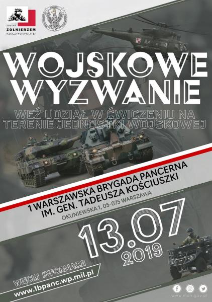 Zajęcia odbędą się w dniu 13 lipca 2019 r. w godzinach 10.00 – 19.00 na terenie 1. Warszawskiej Brygady Pancernej w Warszawie Wesołej (stawiennictwo do godz. 9.45 w Klubie 1. WBPanc przy ulicy Plac Wojska Polskiego 129.