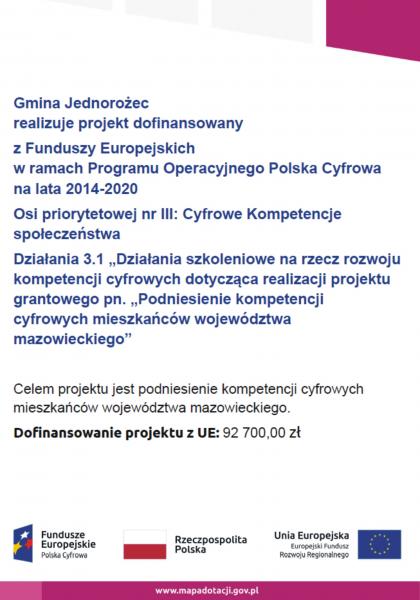 Szanowni Państwo informujemy, że Gmina Jednorożec przystąpiła do realizacji projektu pn. ” Podniesienie kompetencji cyfrowych mieszkańców województwa mazowieckiego”, na którego realizację otrzymała kwotę 92 700,00 zł.