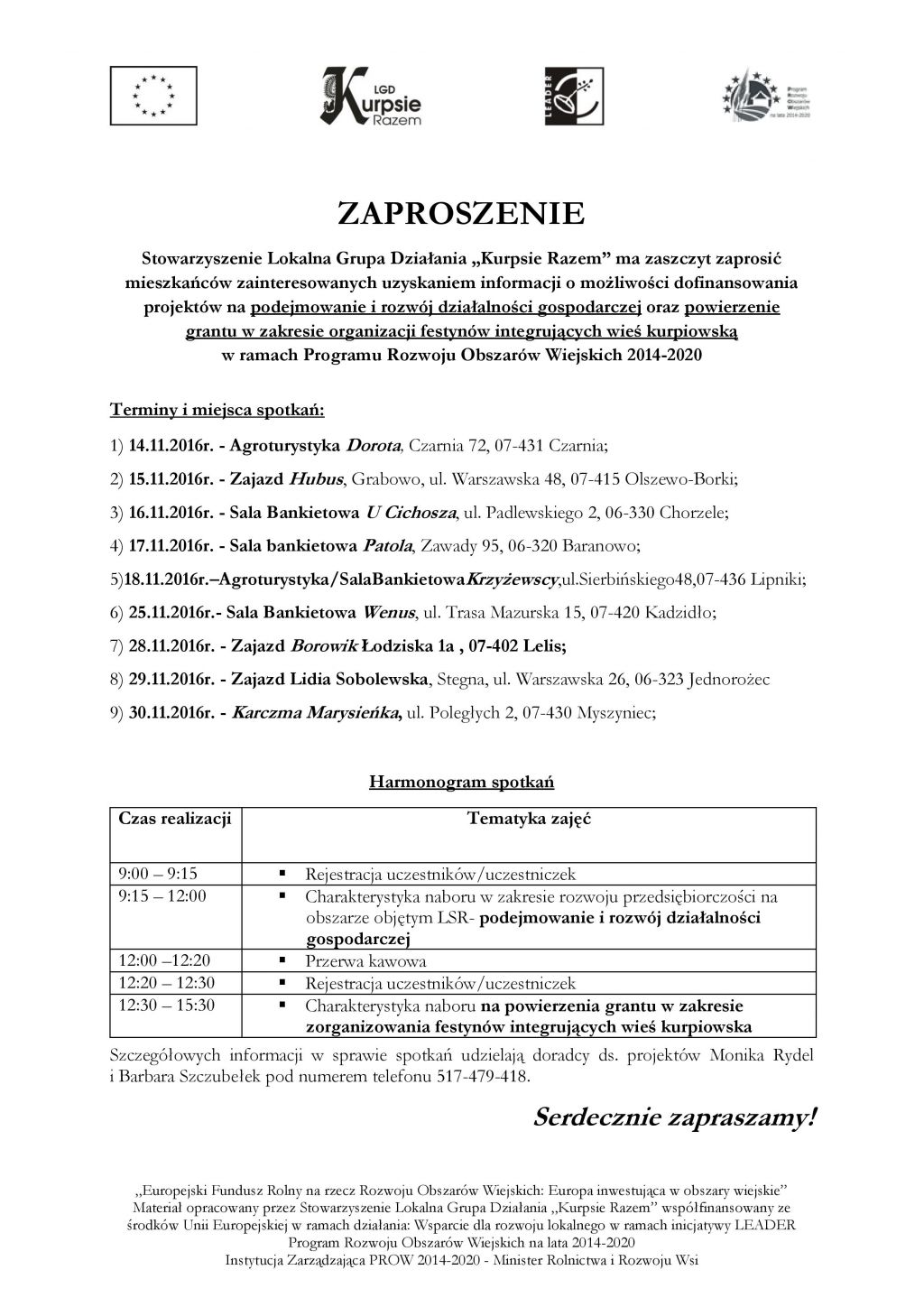 Stowarzyszenie Lokalna Grupa Działania „Kurpsie Razem” ma zaszczyt zaprosić mieszkańców zainteresowanych uzyskaniem informacji o możliwości dofinansowania projektów na podejmowanie i rozwój działalności gospodarczej oraz powierzenie grantu w zakresie organizacji festynów integrujących wieś kurpiowską w ramach Programu Rozwoju Obszarów Wiejskich 2014-2020