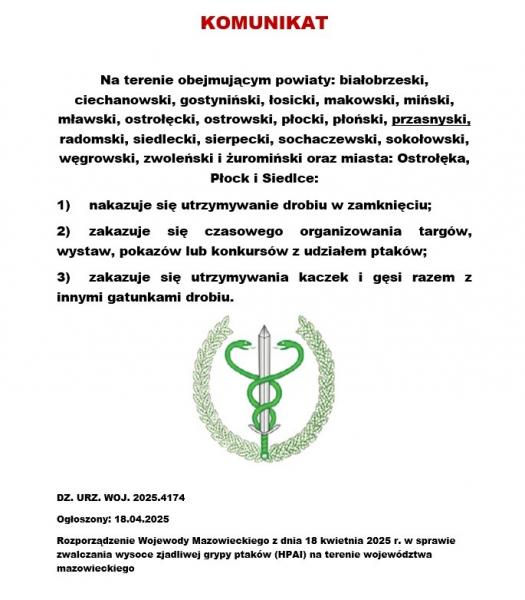 Rozporządzenie Wojewody Mazowieckiego z dnia 18 kwietnia 2025 r. w sprawie zwalczania wysoce zjadliwej grypy ptaków (HPAI) na terenie województwa mazowieckiego