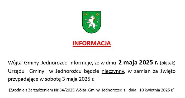 Wójta Gminy Jednorożec informuje, że w dniu 2 maja 2025 r. (piątek) Urzędu Gminy w Jednorożcu będzie nieczynny, w zamian za święto przypadające w sobotę 3 maja 2025 r.