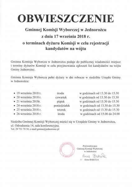 Obwieszczenie Gminnej Komisji Wyborczej w Jednorożcu z dnia 17 września 2018 roku o terminach dyżuru Komisji w celu rejestracji kandydatów na wójta