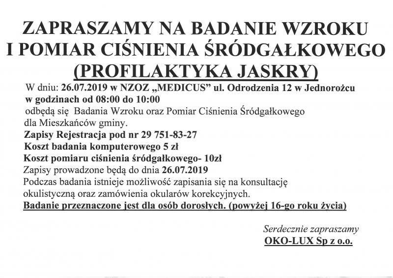 ZAPRASZAMY NA BADANIE WZROKU I POMIAR CIŚNIENIA ŚRÓDGAŁKOWEGO (PROFILAKTYKA JASKRY)