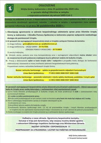Ogłoszenie Wójta Gminy Jednorożec z dnia 23 października 2020 roku w sprawie obsługi klientów w związki z rozprzestrzenianiem się wirusa SARS-CoV-2