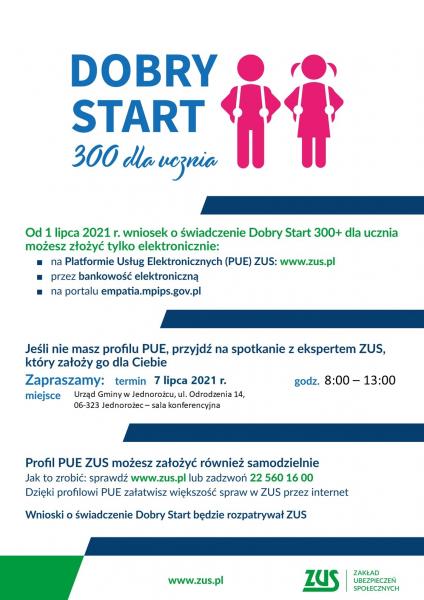 Jeśli chcesz złożyć wniosek Dobry Start 300 + to przypominamy, że jutro tj. 07 lipca 2021 r. w Urzędzie Gminy będzie pełnił dyżur pracownik ZUS który pomoże założyć profil PUE