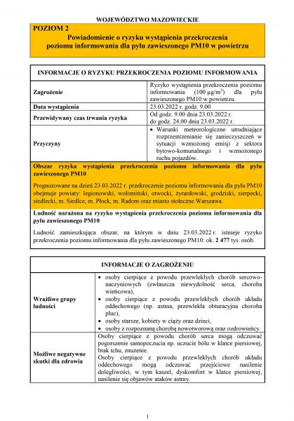 Powiadomienie o ryzyku wystąpienia przekroczenia poziomu informowania dla pyłu zawieszonego PM10 w powietrzu