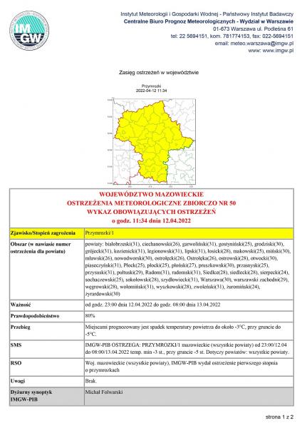 WOJEWÓDZTWO MAZOWIECKIE OSTRZEŻENIA METEOROLOGICZNE ZBIORCZO NR 50 WYKAZ OBOWIĄZUJĄCYCH OSTRZEŻEŃ o godz. 11:34 dnia 12.04.2022
