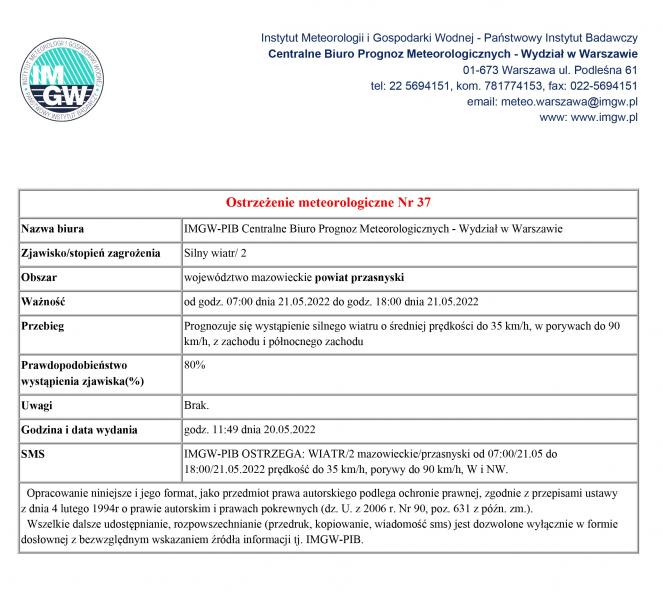 Ostrzeżenie meteorologiczne Nr 37 Nazwa biura IMGW-PIB Centralne Biuro Prognoz Meteorologicznych - Wydział w Warszawie