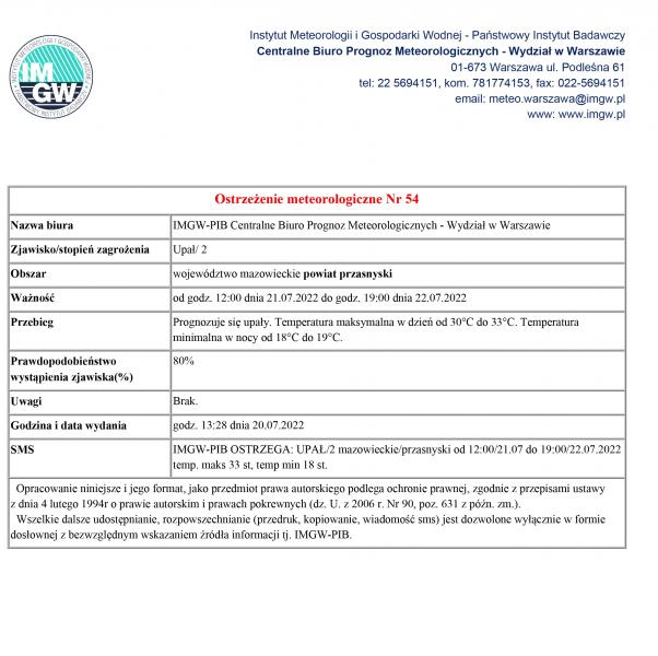 Ostrzeżenie meteorologiczne Nr 54 Nazwa biura IMGW-PIB Centralne Biuro Prognoz Meteorologicznych - Wydział w Warszawie