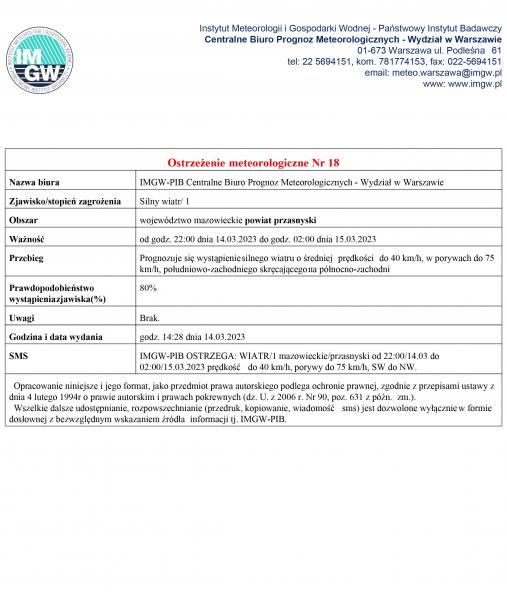 Ostrzeżenie meteorologiczne Nr 18 Nazwa biura IMGW-PIB Centralne Biuro Prognoz Meteorologicznych - Wydział w Warszawie