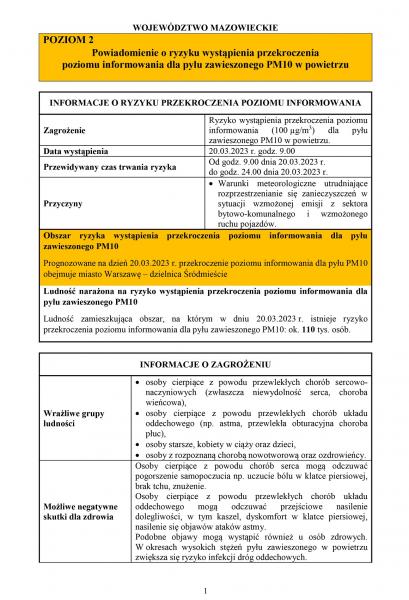 Powiadomienie o ryzyku wystąpienia przekroczenia poziomu informowania dla pyłu zawieszonego PM10 w powietrzu