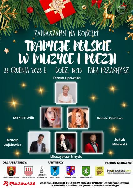 To wyjątkowy, premierowy projekt, który zabrzmi już 28 grudnia o godz. 18:45 w przasnyskiej Farze. Tradycje w polskiej muzyce i poezji, w pierwszej części koncertu, odkryjemy za pomocą liryki i wspaniałych piosenek m.in. z polskich filmów „Ostatni dzwonek”, czy „Quo vadis”. W drugiej części koncertu, o polskich tradycjach opowiemy za pomocą wierszy, a także kolęd, pastorałek i piosenek świątecznych stworzonych na przestrzeni ostatnich stu lat.