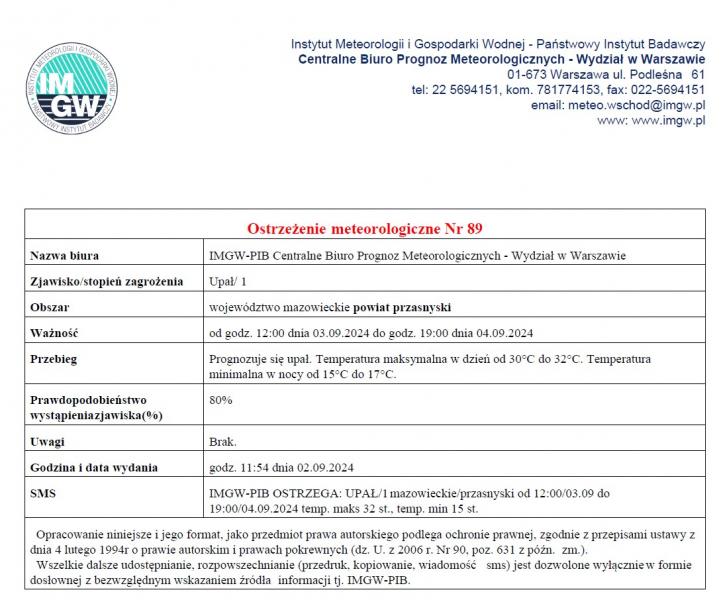 Ostrzeżenie meteorologiczne Nr 89 Nazwa biura IMGW-PIB Centralne Biuro Prognoz Meteorologicznych - Wydział w Warszawie