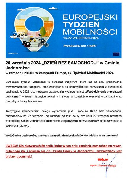 20 września 2024 „DZIEŃ BEZ SAMOCHODU” w Gminie Jednorożec