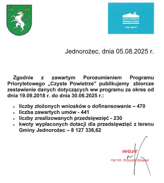Zgodnie z zawartym Porozumieniem Programu Priorytetowego „Czyste Powietrze” publikujemy zbiorcze zestawienie danych dotyczących ww programu za okres od dnia 19.09.2018 r. do dnia 30.06.2025 r.: