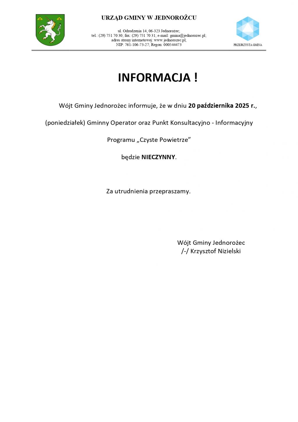 INFORMACJA WÓJTA GMINY JEDNOROŻEC